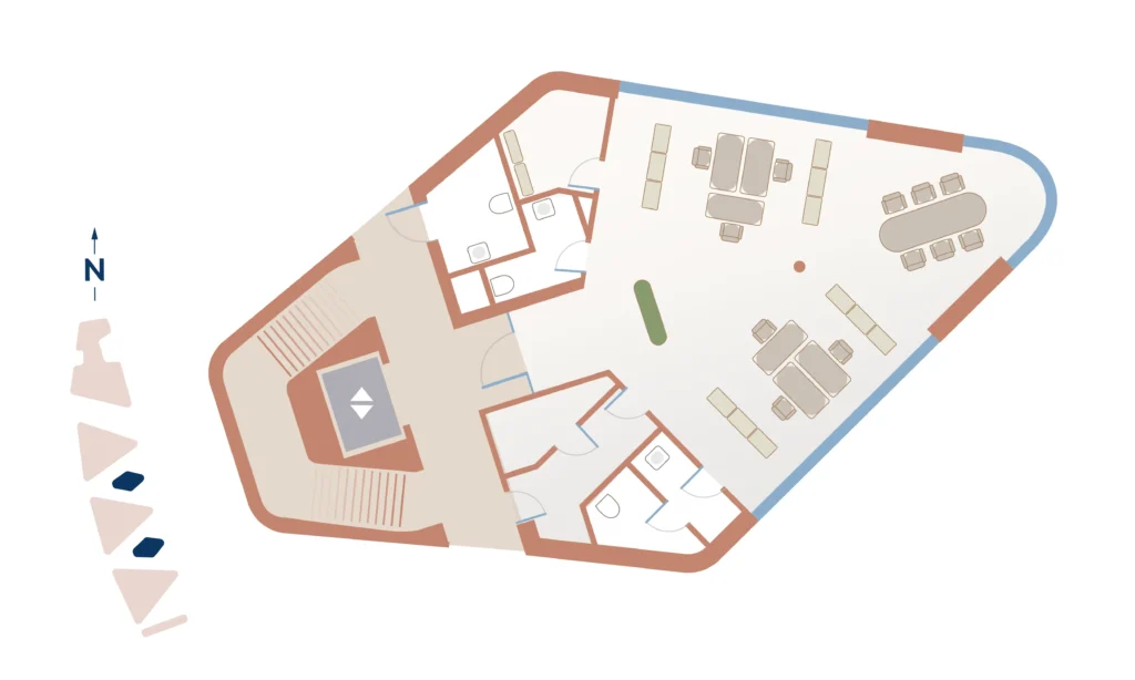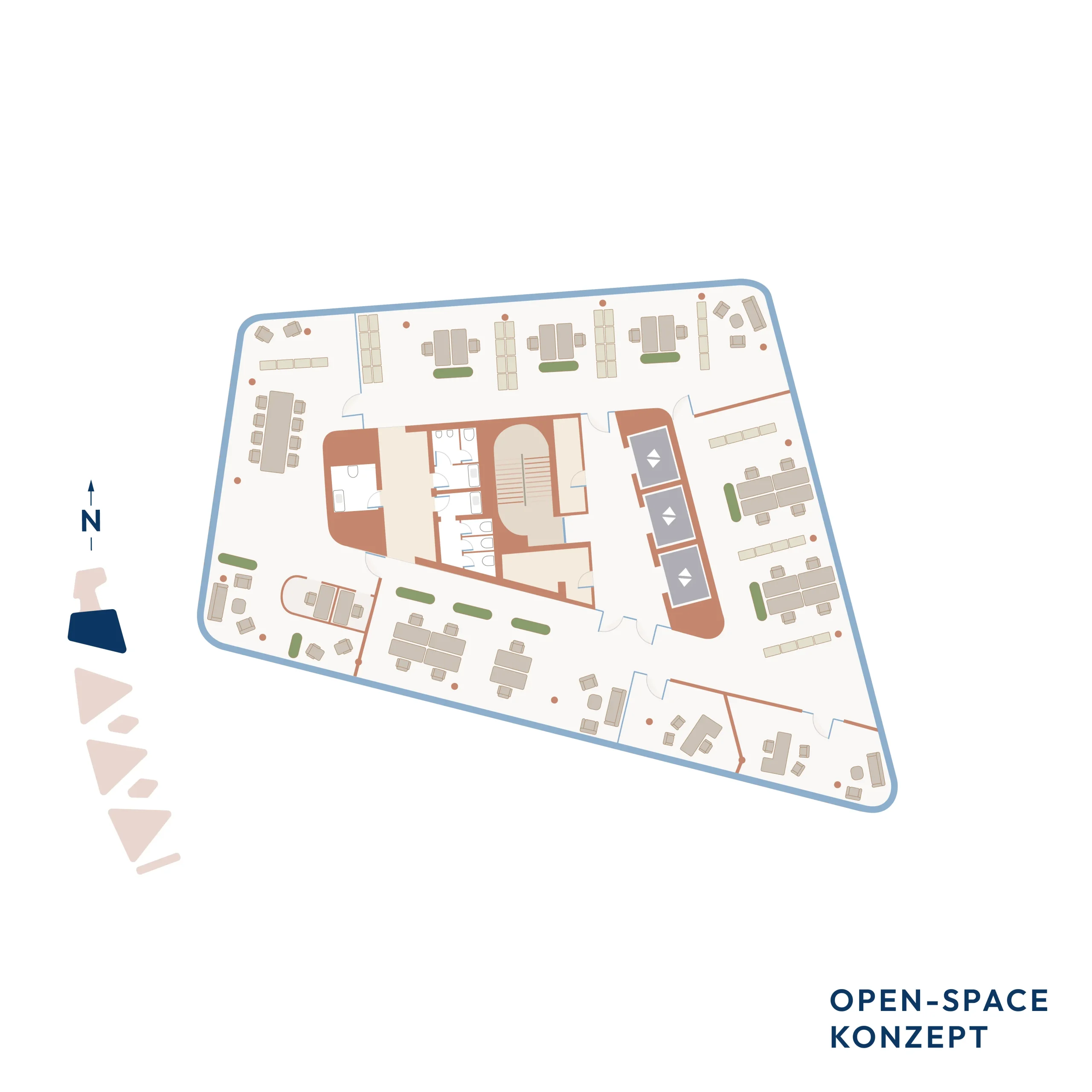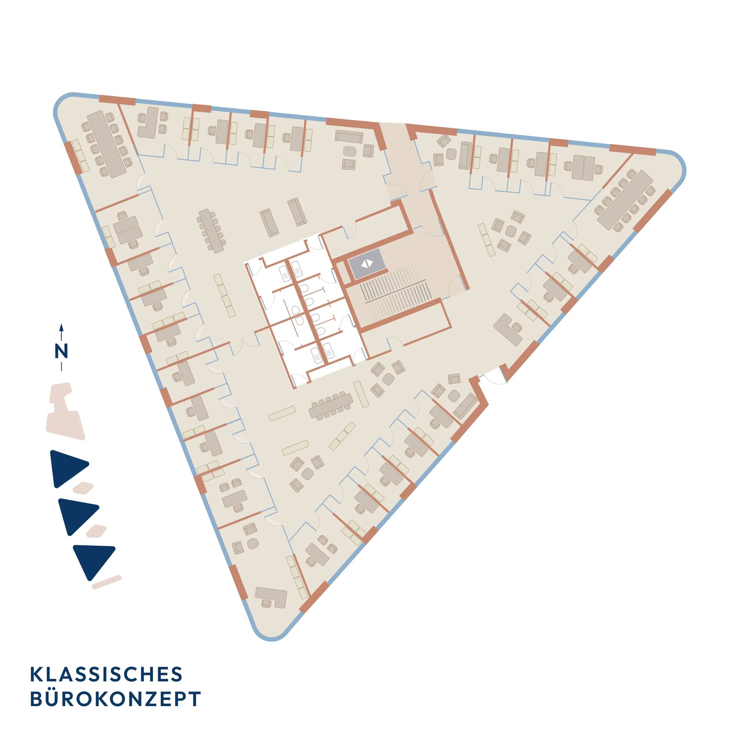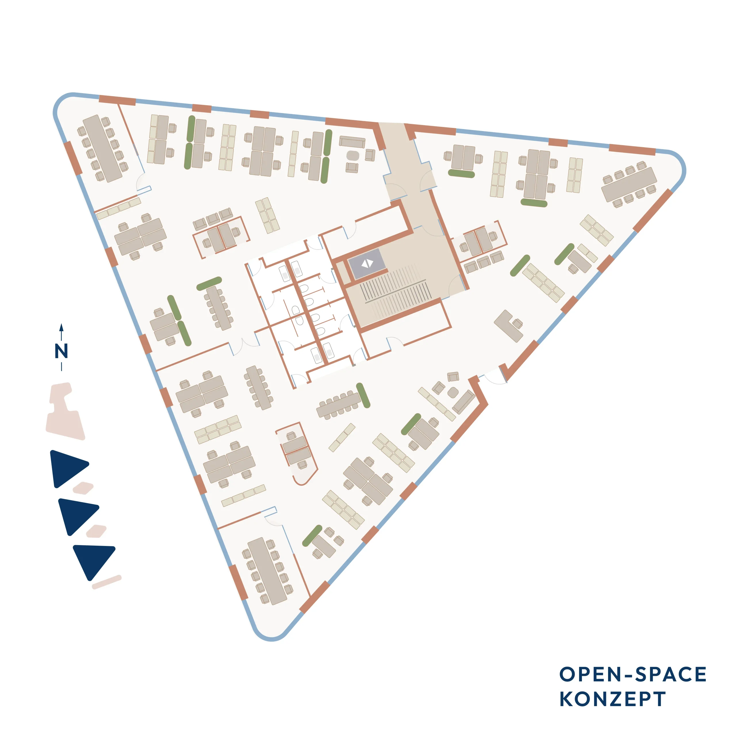 Jedes der dreigeschossigen DreiecksKontore bietet pro Etage ca. 940 m² Bürofläche. Alle Flächen sind ausbauflexibel und können nach individuellen Mieterwünschen realisiert werden – für eine Arbeitsumgebung, die sich exakt an Ihre Anforderungen anpasst.