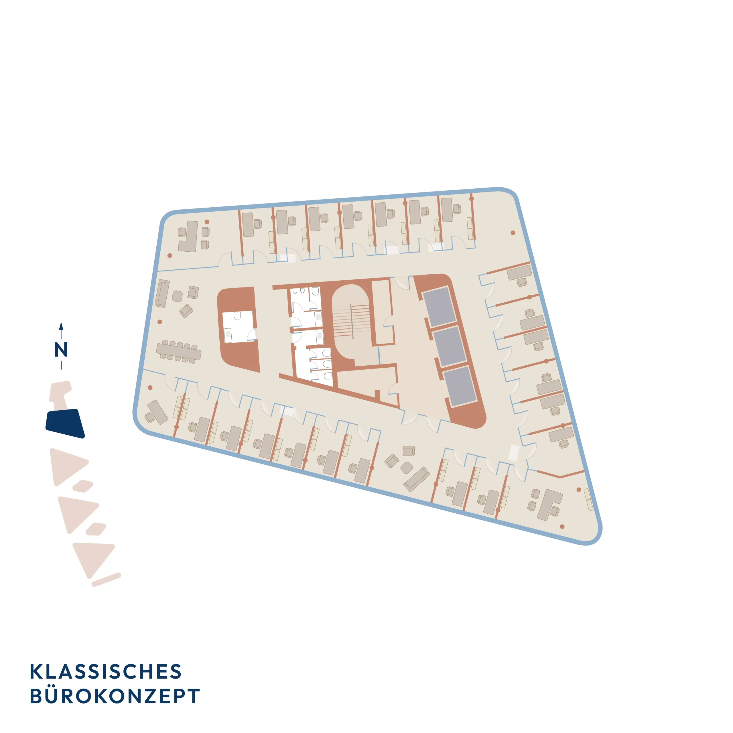 Ob klassische Raumstruktur, offenes Konzept oder hybride Lösung: Die flexibel gestaltbaren Etagen mit 630 bis 675 m² pro Ebene bieten ideale Voraussetzungen für unterschiedlichste Unternehmensformen.